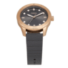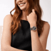 Presenta una esfera gris con efecto “rayos de sol” y una caja en tono oro rosa, que contrasta elegantemente con la correa de silicona en tono gris para un look moderno y versátil.